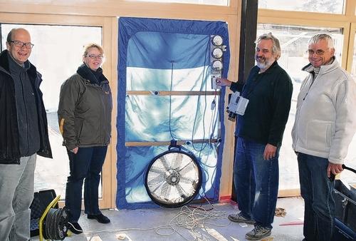 Auch wenn die Turnhalle schon bald und das Hallenbad nach den Sommerferien fertig sein sollen, der „Blower-Door-Test“ wird nach der Aufarbeitung der Schwachstellen durch die Handwerker noch einmal wiederholt. Diesmal war nur eine qualitative Messung möglich, die aufzeigte, wo es hineinzieht. Beim nächsten Mal muss das Gebäude eine Stunde lang eine Druckdifferenz von 50 Pascal halten, was etwa der Windstärke sechs auf der Fassade entspricht. Damit wird dann nachgewiesen, dass es nirgends mehr hinein zieht, das Gebäude also dicht ist.