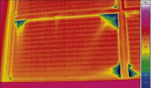 Die eigentlichen Überraschungen beim „Blower-Door-Test“ waren denn auch woanders zu finden: Aus einem Kabelkanal strömte merklich kalte Luft ins Gebäude, bei leichtem Frost draußen und etwa 15 Grad Celsius drinnen leicht zu merken. Unauffälligeren Schwachstellen kam Dr. Arnim Schwab mit einer Wärmebildkamera auf die Spur: Eindeutig war zu sehen, wo Elektrokabel nach draußen führen und dort derzeit lose enden oder dass einige Dichtungen zwischen Fenster und Rahmen noch nicht richtig funktionieren.
