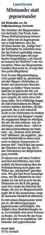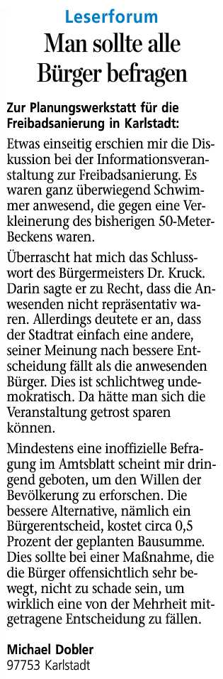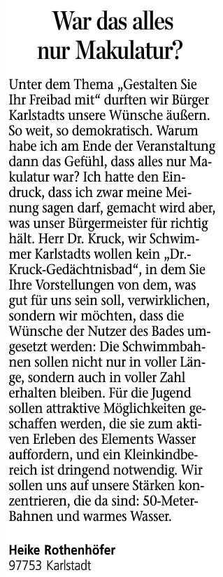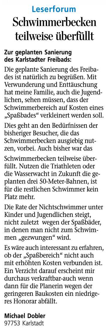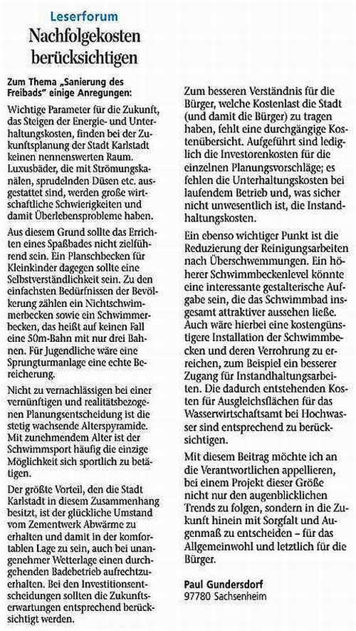 zum Freibad - Karlstadt Meinungen und Anregungen der Karlstadter Bürger sowie der Freibadbesucher zur Planung und Sanierung Lange Artikel werden zunächst beim Öffnen kleiner und unleserlich dargestellt, sie können mit der Tastenkombination (Strg und +) jedoch vergrößert werden! |