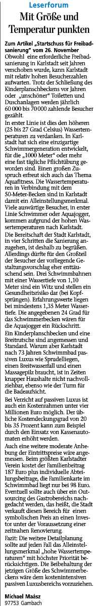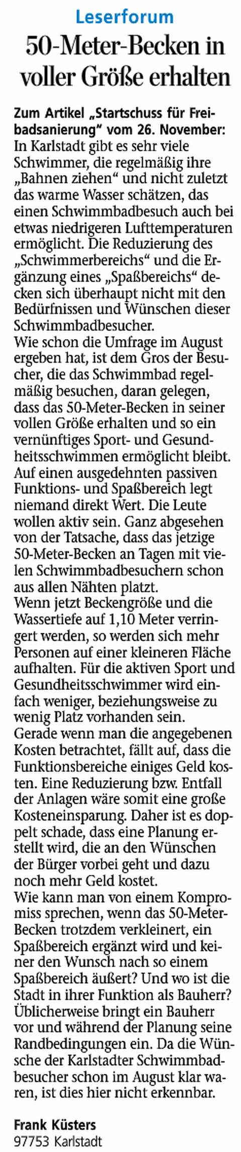 MP 13.01.2012 Nachfolgekosten berücksichtigen - zum Artikel MP 21.12.2011 Miteinander statt gegeneinander - zum Artikel MP 17.12.2011 Man sollte alle Bürger fragen - zum Artikel MP 17.12.2011 War das alles nur Makulatur? - zum Artikel MP 14.12.2011 Mit Größe und Temperatur punkten zum Artikel MP 07.12.2011 Kioskbetreiber im Freibad kündigten - zum Artikel MP 07.12.2011 Planungswerkstatt - Ideen zur FB-Umgestaltung - zum Artikel MP 30.11.2011 50-Meter-Becken in voller Größe erhalten - zum Artikel MP 28.11.2011 Schwimmerbecken teilweise überfüllt - zum Artikel * |