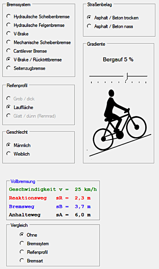 Bremssytem, Reifenprofil, Straßenbelag, Steigung, Gefälle und Fahrer bzw. Fahrerin.